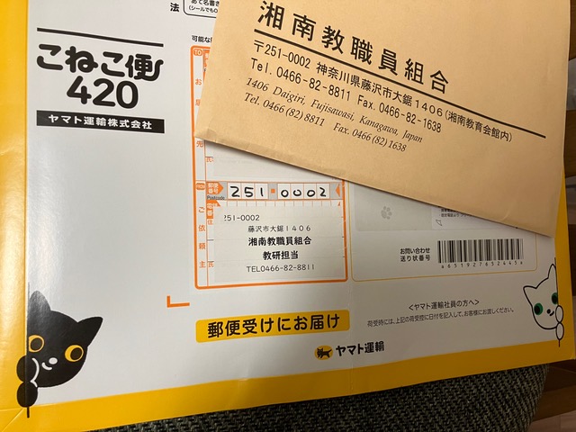 3月2日(月曜日) 「こねこ便」湘南教職員組合(湘南教組)から、昨夏の教育研究集会(教研)の報告書(冊子)が届いた。いつもは郵便局の青色の「レターパック」で届くが、今回はヤマト運輸の黄色い「こねこ便」で送られてきた=写真。「こねこ便」に変更した理由は知らないけど、子猫があしらわれていて少しかわいい。