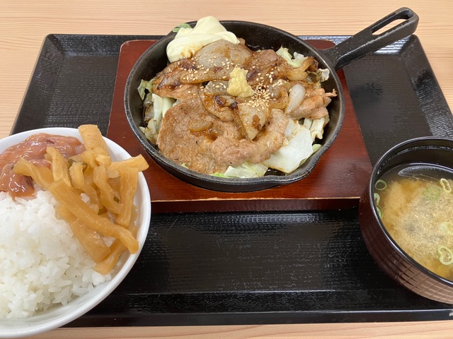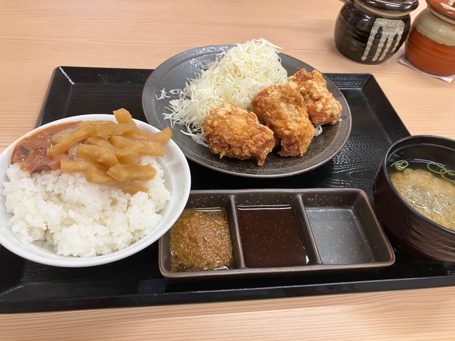 8月30日(土曜日) 「からやま」ニンニクの効いた極ダレが特徴の唐揚げ専門「からやま」で、からやま定食(唐揚げ定食)を食べた=写真上。引っ越し初日に食べて以来のファン。皮はパリパリで肉がジューシーな唐揚げはもちろん美味しいが、それ以上に感動するのが、イカの塩辛と大根の漬物が食べ放題なところ。これだけで何杯もご飯が食べられる。しかも味噌汁にはとろろ昆布がたっぷり。最高じゃん。ちなみに「からやま」は、しょうが焼き定食=写真下=も美味しい。肉厚の豚とシャキシャキのキャベツの相性が抜群だ。